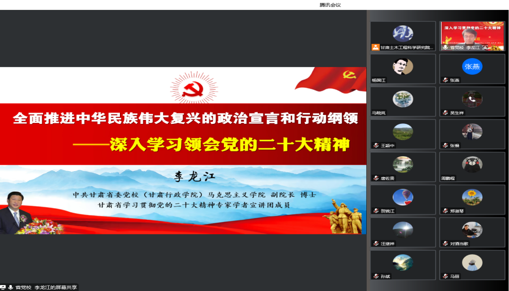 會議邀請省委黨校馬克思主義學(xué)院副院長、全省學(xué)習(xí)貫徹黨的二十大精神專家學(xué)者宣講團(tuán)成員李龍江教授作了題為《全面推進(jìn)中華民族偉大復(fù)興的政治宣言和行動綱領(lǐng)——深入學(xué)習(xí)領(lǐng)會黨的二十大精神》的專題講座。以黨的二十大報(bào)告為主線,結(jié)合國有企業(yè)高質(zhì)量發(fā)展具體事例,對黨的二十大精神進(jìn)行了全面深入、系統(tǒng)詳盡的闡釋解讀,使全體黨員干部職工從多方面、多角度對黨的二十大精神的核心要義有了更為清晰和深刻的認(rèn)識,對進(jìn)一步全面學(xué)習(xí)、全面把握、全面落實(shí)黨的二十大精神起到了積極指導(dǎo)作用。