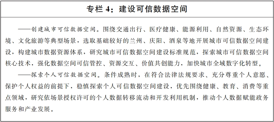 (十一)建設(shè)公共數(shù)據(jù)流通利用基礎(chǔ)設(shè)施。根據(jù)國家政策文件規(guī)定,探索城市、個人等可信數(shù)據(jù)空間建設(shè),鼓勵建設(shè)數(shù)聯(lián)網(wǎng)、數(shù)據(jù)元件等數(shù)據(jù)流通基礎(chǔ)設(shè)施,促進(jìn)數(shù)據(jù)高效便利可信流通。圍繞工業(yè)制造、現(xiàn)代農(nóng)業(yè)、醫(yī)療健康、綠色低碳等重點行業(yè)領(lǐng)域,探索數(shù)據(jù)基礎(chǔ)設(shè)施技術(shù)路線試驗,為國家數(shù)據(jù)基礎(chǔ)設(shè)施建設(shè)貢獻(xiàn)“甘肅方案”。推動省內(nèi)數(shù)據(jù)基礎(chǔ)設(shè)施規(guī)則、管理、標(biāo)準(zhǔn)相通相容,促進(jìn)跨區(qū)域跨層級設(shè)施互聯(lián)、能力互通,實現(xiàn)數(shù)據(jù)利用方式向共享匯聚和應(yīng)用服務(wù)能力并重的方向轉(zhuǎn)變。