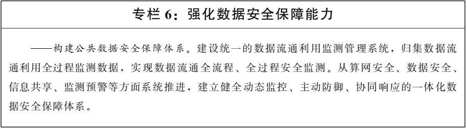 (十八)構(gòu)建公共數(shù)據(jù)安全保障體系。加強對涉及國家安全、商業(yè)秘密、個人隱私等數(shù)據(jù)的保護。建立健全公共數(shù)據(jù)資源開發(fā)利用安全風(fēng)險識別評估、監(jiān)測預(yù)警、應(yīng)急處置等數(shù)據(jù)安全規(guī)范體系,明確數(shù)據(jù)資源生產(chǎn)、加工使用、產(chǎn)品開發(fā)及經(jīng)營等全過程相關(guān)主體安全責(zé)任,開展事前、事中、事后業(yè)務(wù)規(guī)范性審查和監(jiān)督管理。加強數(shù)據(jù)安全聯(lián)管聯(lián)治,嚴(yán)厲打擊非法獲取、出售或提供數(shù)據(jù)的黑灰產(chǎn)業(yè),嚴(yán)禁超出授權(quán)范圍使用數(shù)據(jù),嚴(yán)格管控未依法依規(guī)公開的原始公共數(shù)據(jù)直接進(jìn)入市場。