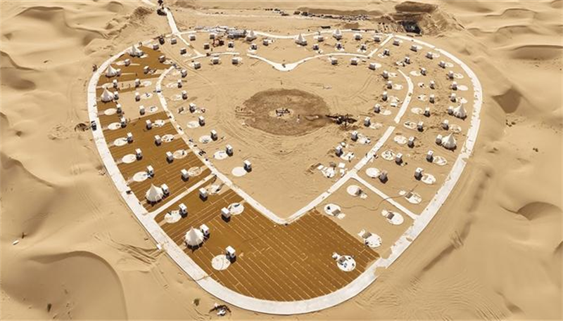 項目占地面積約13.33公頃,總建筑面積15952㎡。建設內容包括游客服務中心、休閑中心及230座帳篷設施等。設計以優(yōu)美的異形建筑為中心,錯落有致的帳篷環(huán)繞四周,如繁星點綴在沙漠中,形成一道優(yōu)美的風景線。