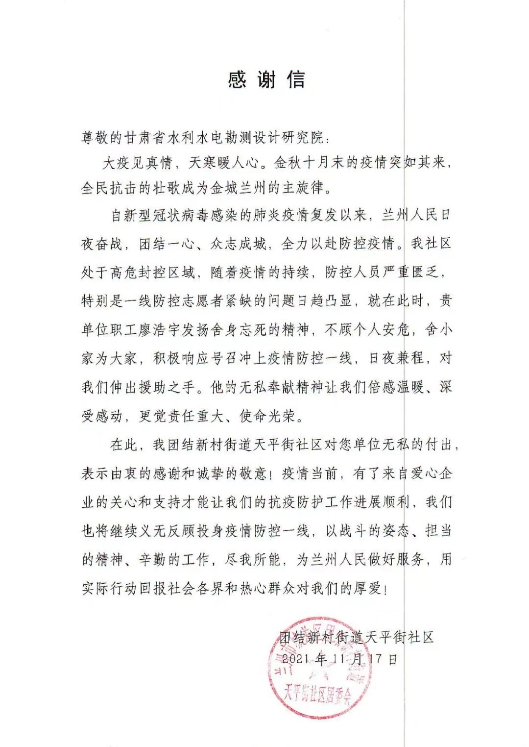 近日,水電設計院收到中志協(xié)蘭州服務隊和團結新村街道天平街社區(qū)發(fā)來的感謝信。信中對水電設計院規(guī)劃院員工廖浩宇在此次疫情發(fā)生后,主動請纓參加疫情防控服務工作,甘當疫情防控最美逆行者,持續(xù)堅持26天志愿者服務的先進事跡表示感謝。