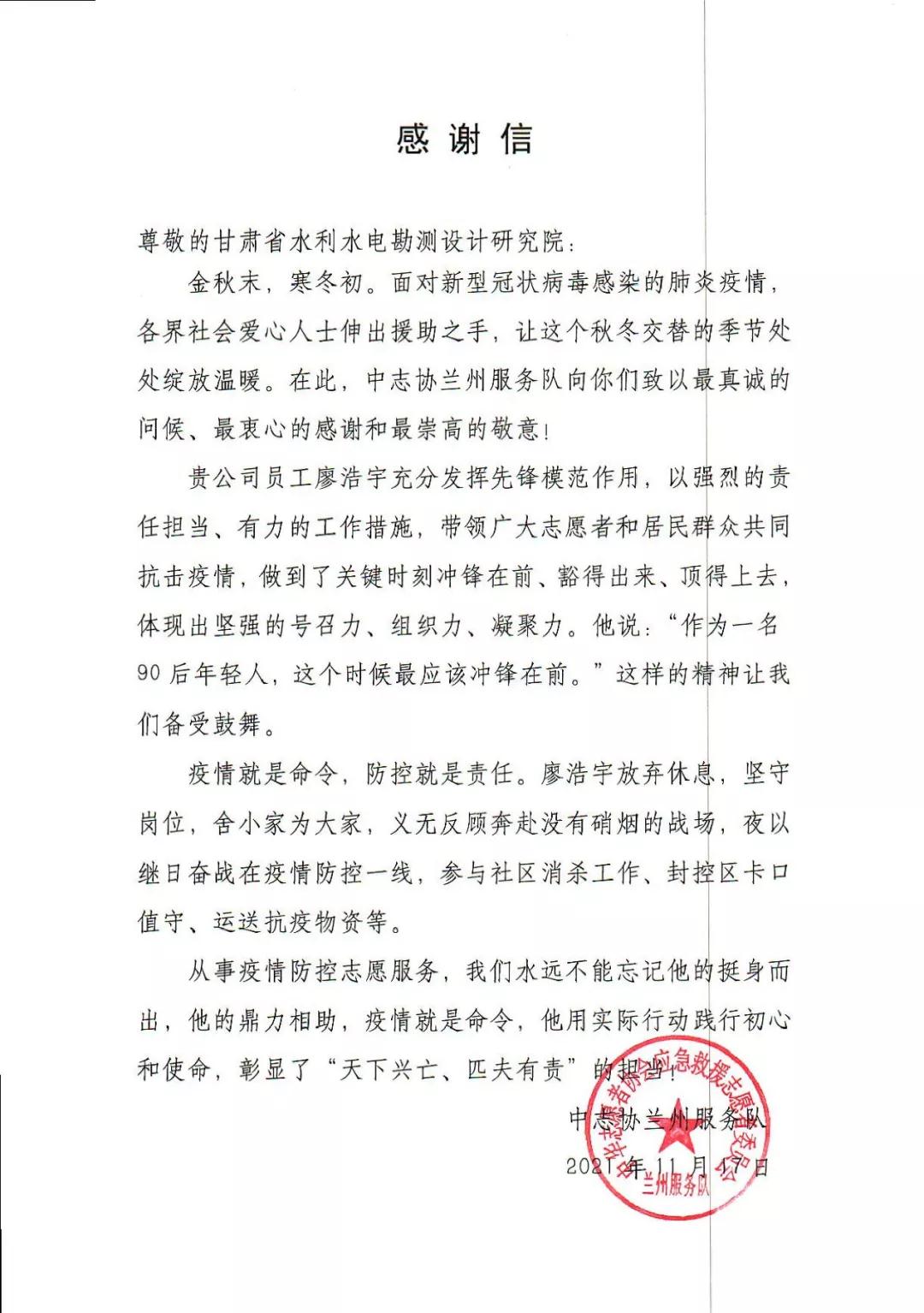 26天堅守疫情防控一線無怨無悔 水電設計院志愿者收到感謝信