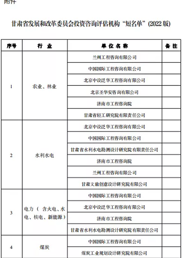 近日,省發(fā)改委公布2022年進(jìn)入省發(fā)改委投資咨詢?cè)u(píng)估機(jī)構(gòu)企業(yè)名單,甘肅省水利水電勘測(cè)設(shè)計(jì)研究院有限責(zé)任公司成功入圍三個(gè)行業(yè)板塊。