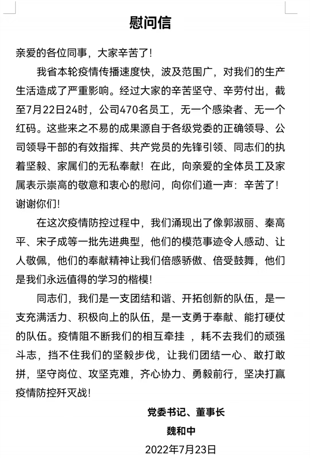 近日,甘肅省建設(shè)監(jiān)理有限責(zé)任公司黨委書記、董事長魏和中向全體職工發(fā)出慰問信,對在疫情期間值守項(xiàng)目一線和抗戰(zhàn)疫情一線的黨員干部職工致以最誠摯的關(guān)心和感謝。同時(shí),號召全體干部職工向疫情防控期間涌現(xiàn)出的一線先進(jìn)典型個(gè)人和共產(chǎn)黨員先鋒者學(xué)習(xí),團(tuán)結(jié)一心、敢打敢拼,堅(jiān)守崗位、攻堅(jiān)克難,齊心協(xié)力、勇毅前行,堅(jiān)決打贏疫情防控殲滅戰(zhàn)。