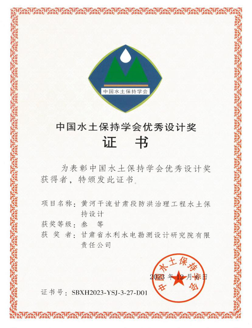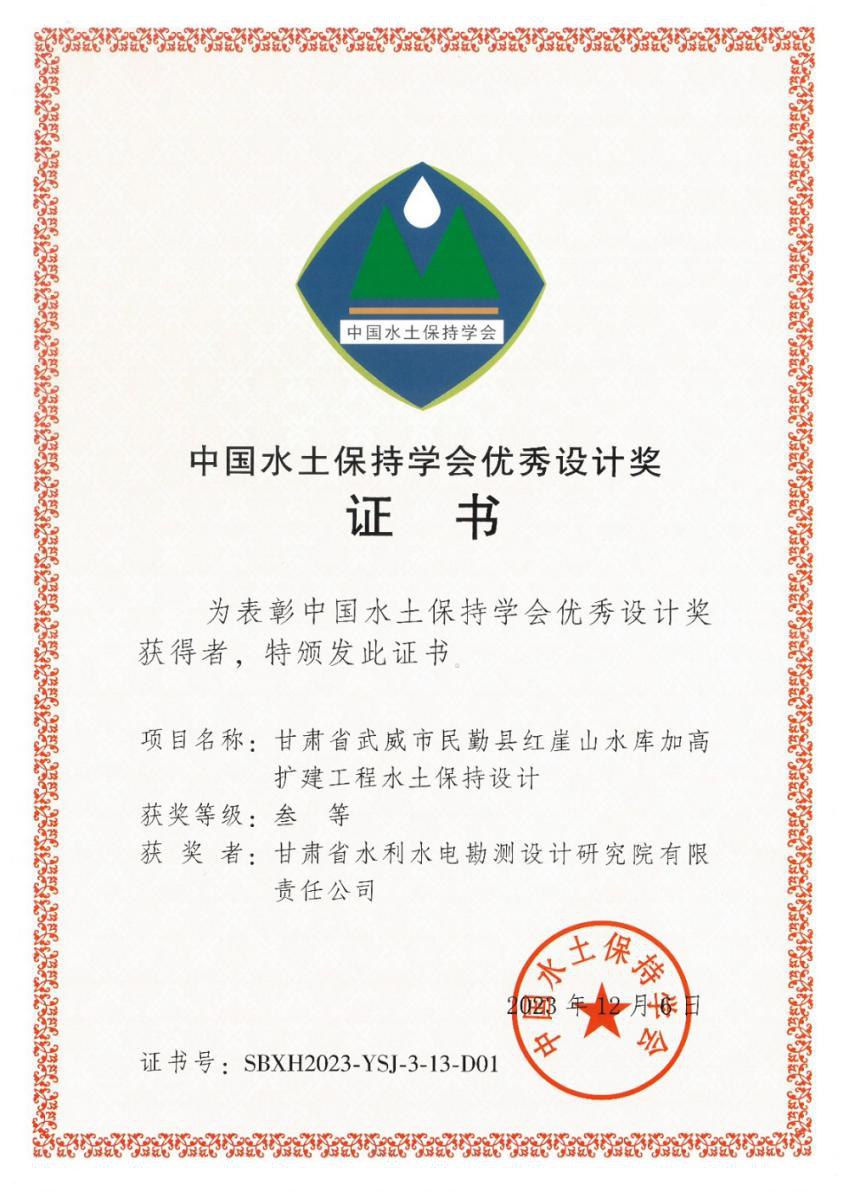 近日,第四屆中國水土保持學(xué)術(shù)大會在福建福州舉行。省水電設(shè)計院勘測設(shè)計的《武威市民勤縣紅崖山水庫加高擴建工程水土保持設(shè)計》《黃河干流甘肅段防洪治理工程水土保持設(shè)計》兩項水土保持設(shè)計成果榮獲第四屆中國水土保持學(xué)會優(yōu)秀設(shè)計三等獎。