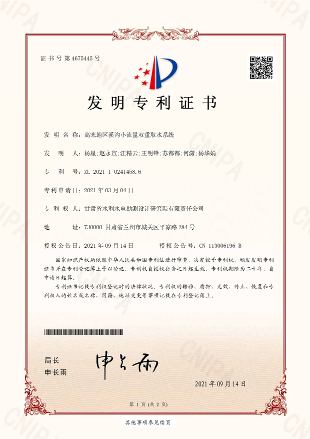 發(fā)明專利證書(shū)—高寒地區(qū)溪溝小流量雙重取水系統(tǒng)